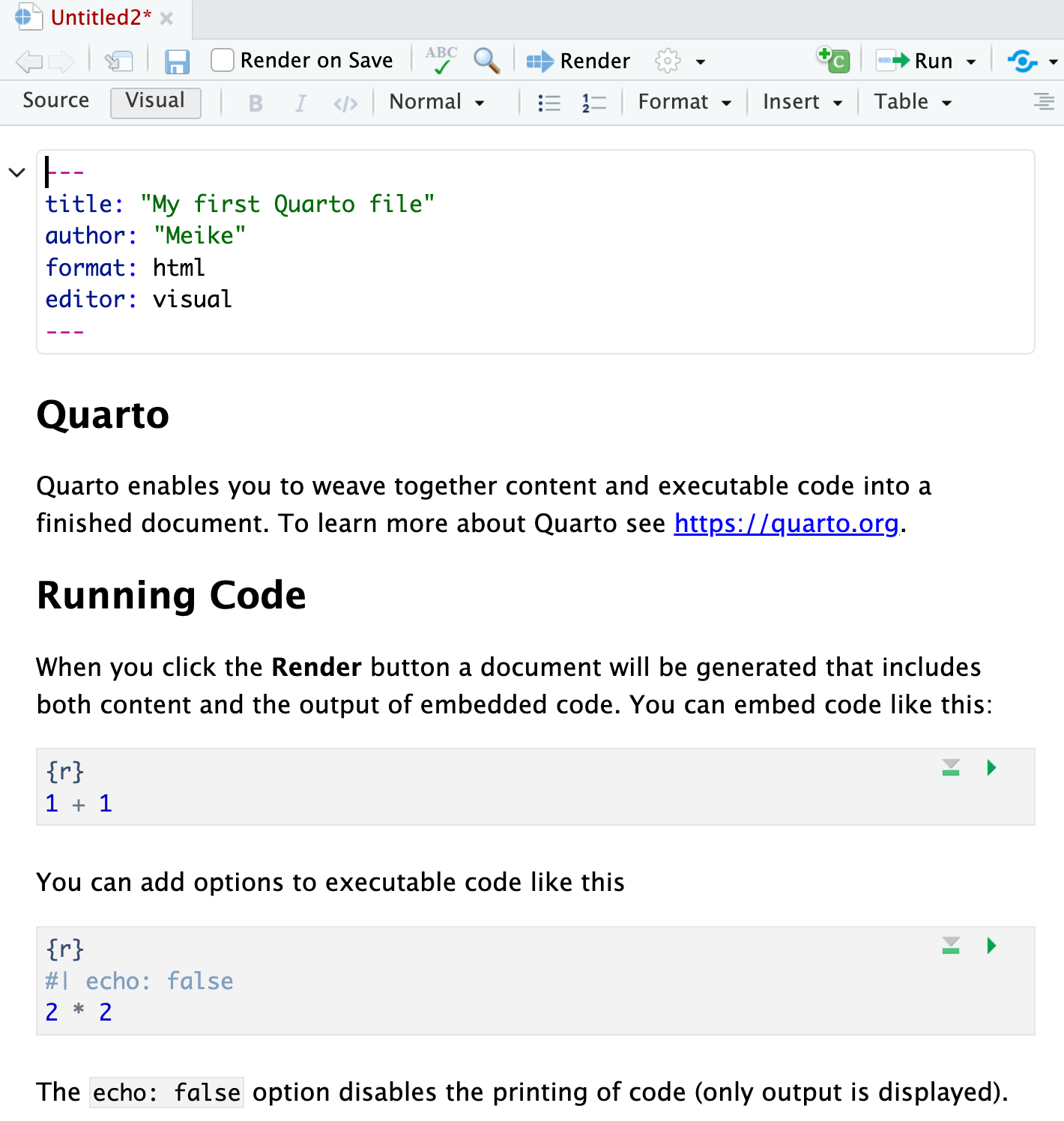 .qmd)Create, you should then see the following in your editor window:.qmd)File -> Save,We create the html file by rendering the .qmd file.