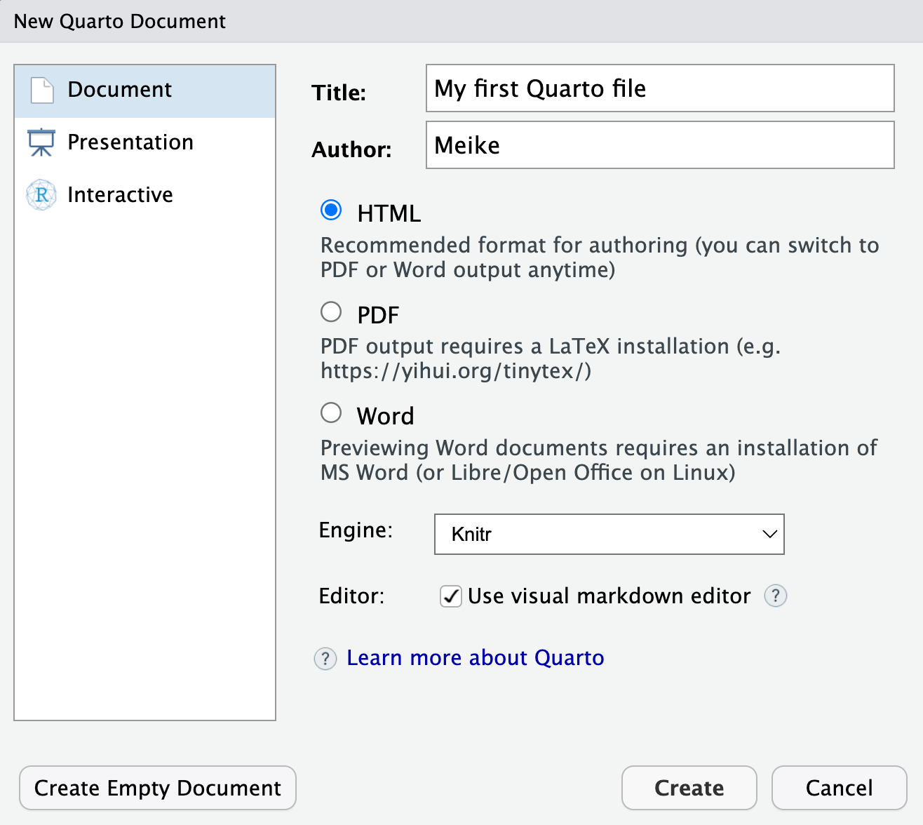 HTML output format (default)KnitrUse visual markdown editorCreate