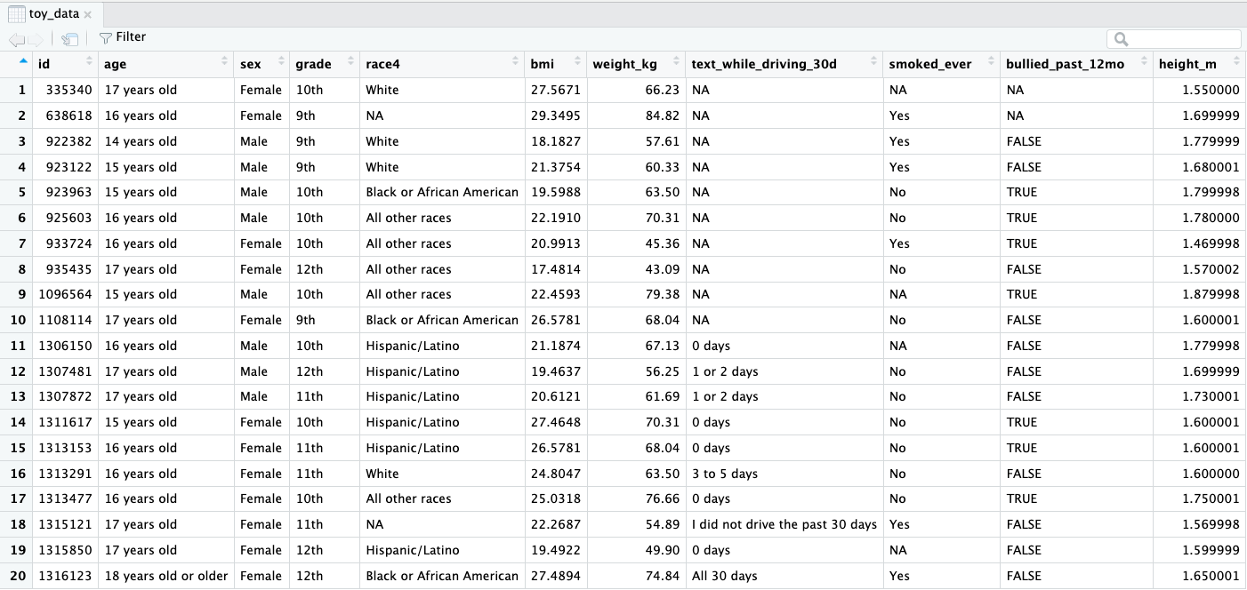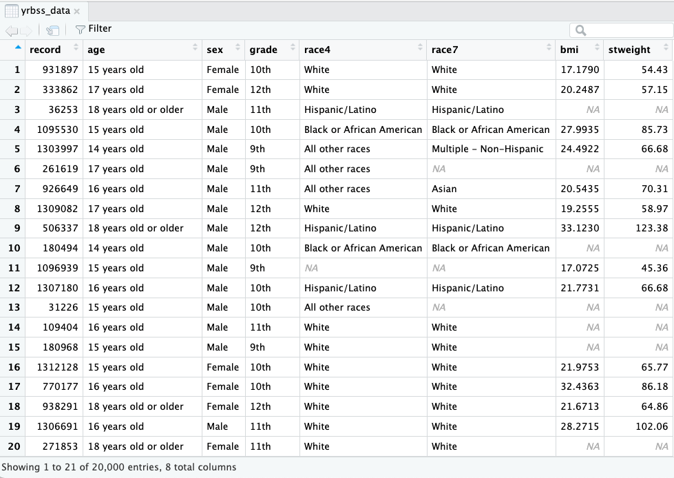 yrbss_data dataset.#| eval: FALSE so that this code is not run while rendering the .qmd file.First 20 rows shown below: