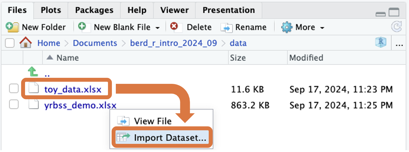 read_excel command from the readxl package to load the xlsx file.data.read_excel() function (data) into an object named toy_data<- is the assignment operatortoy_data will be in your Environment tabtoy_data datasettoy_data dataset.#| eval: FALSE so that this code is not run while rendering the qmd file.