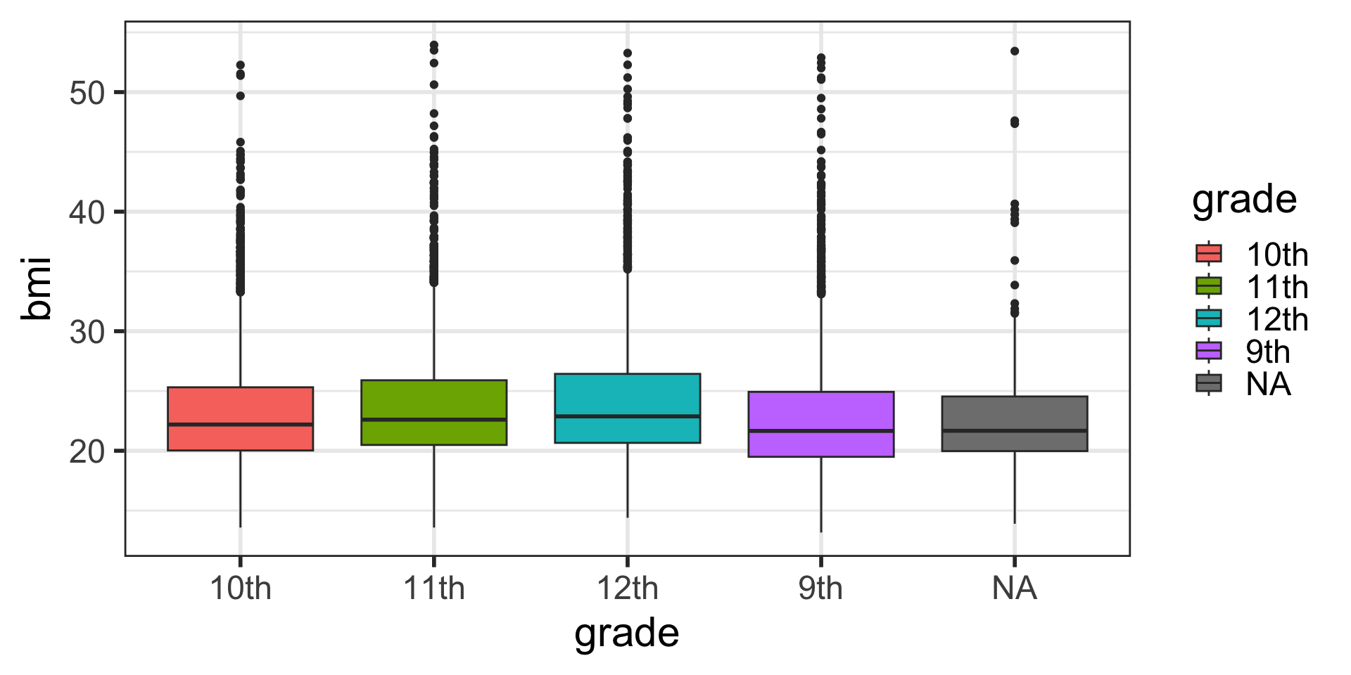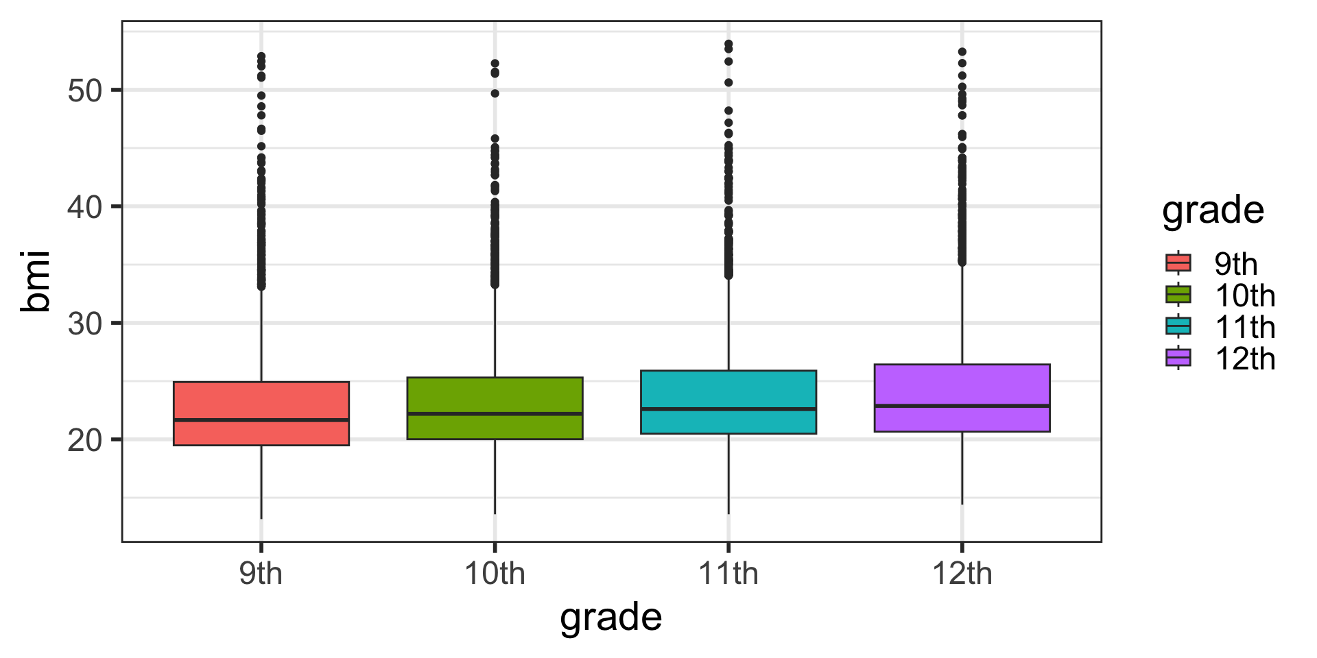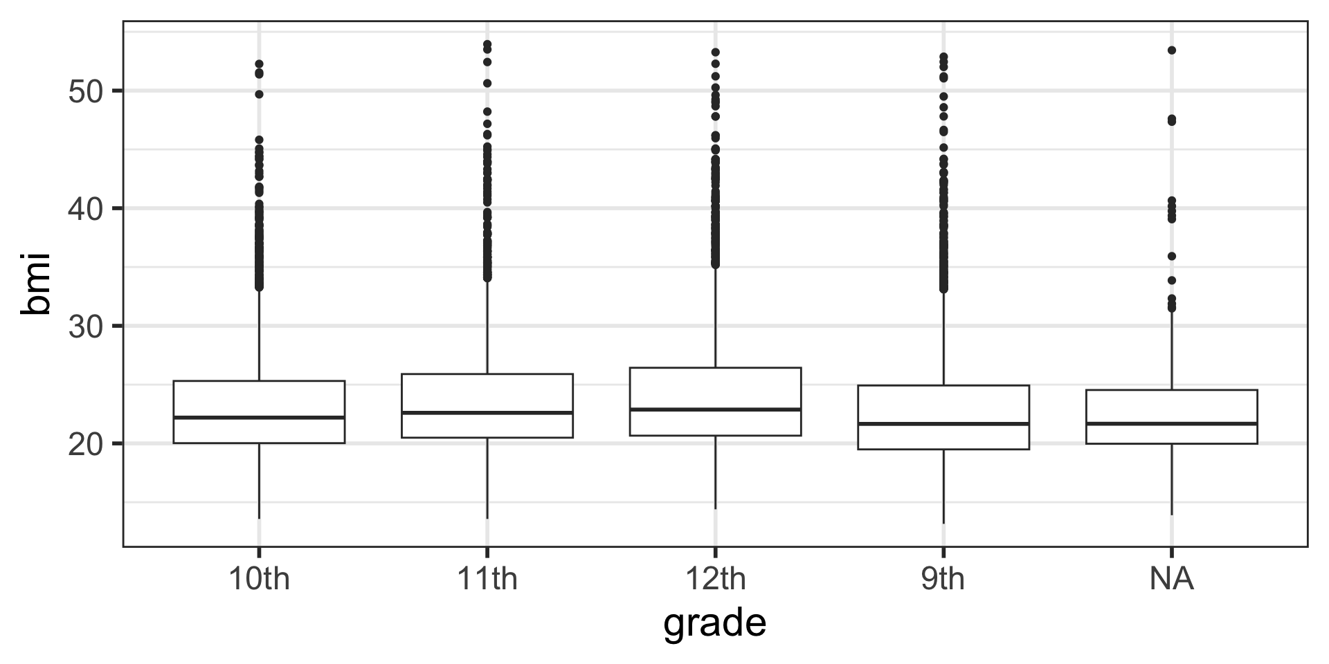 grade_num in yrbss_data that converts grade to numeric.race_cat that relabels race4 to have shorter race category names: W (White), H/L (Hispanic/Latino), B/AA (Black or African American), Other (All other races). Make race_cat a factor variable with levels ordered by the size of the group in descending order.tabyl of the new variable race_cat and race4 to check your work, including the ordering of the factors.ggplot2geom_boxplot()x axis)y axis.The main differences from the scatterplots we created earlier are the geom type and the variables plotted.