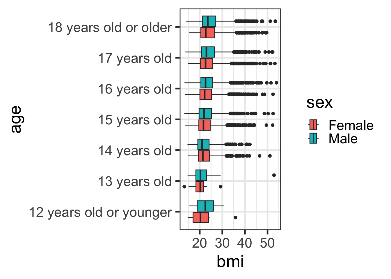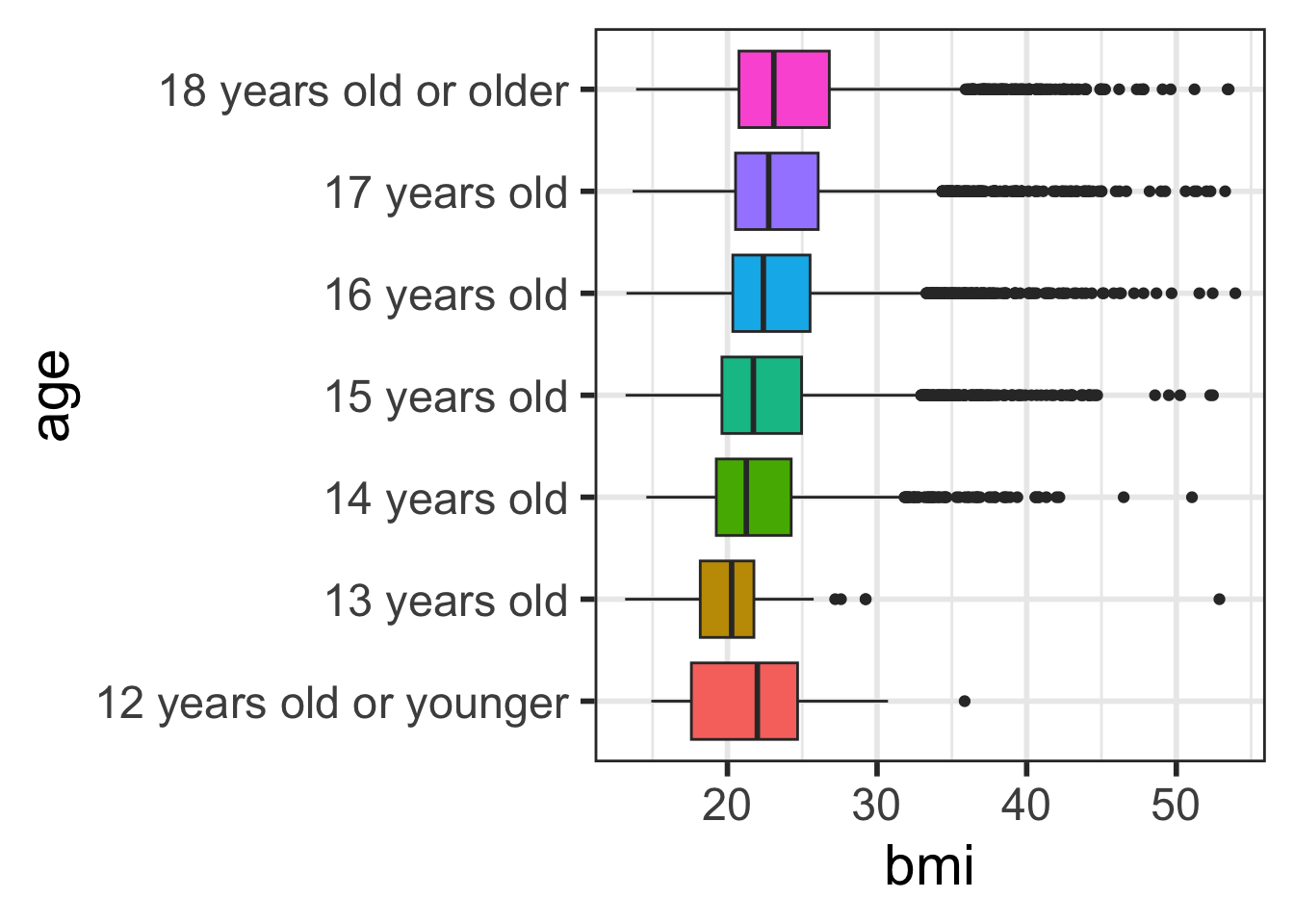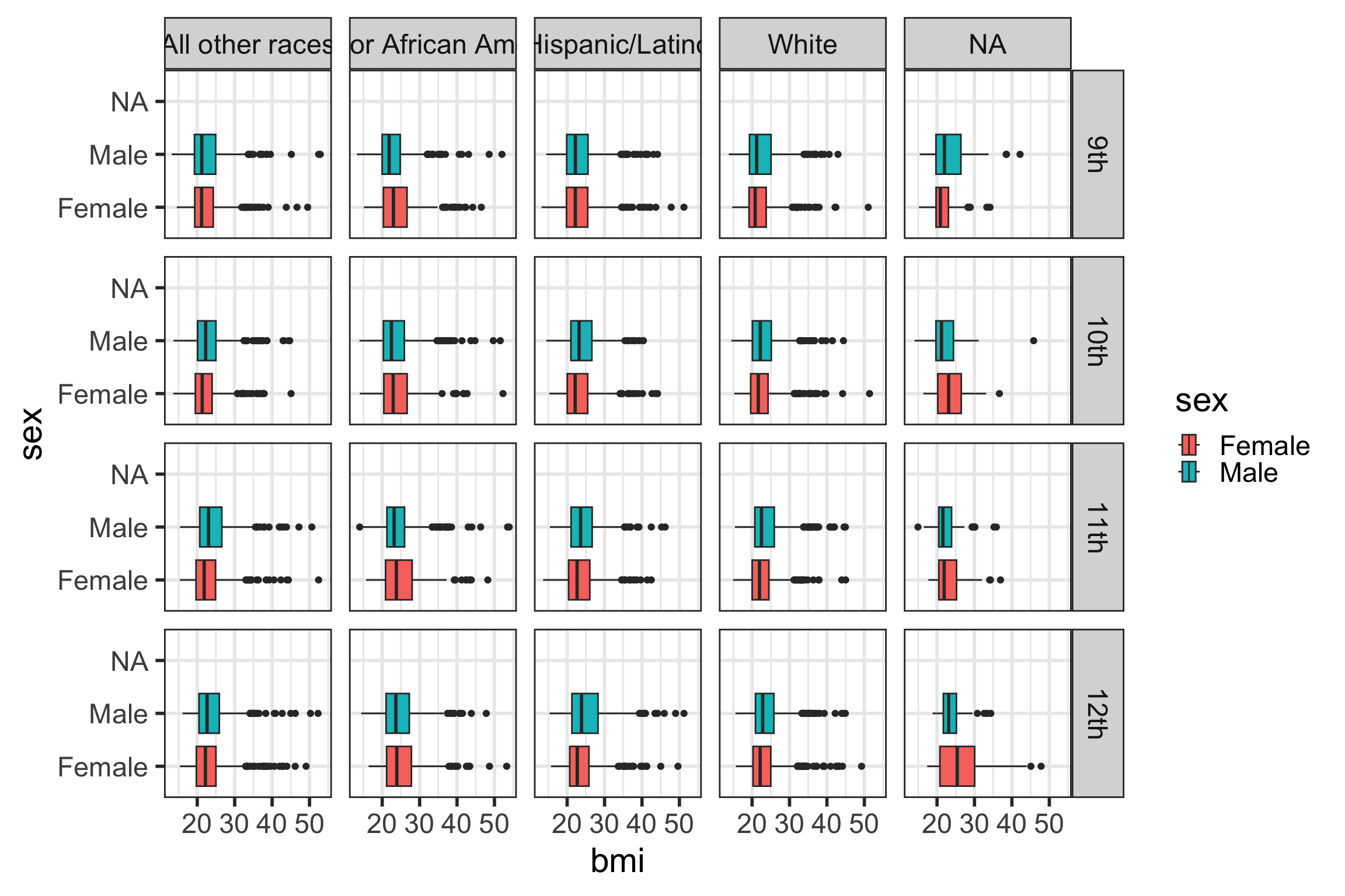 grade_num in yrbss_data that converts grade to numeric.race_cat that relabels race4 to have shorter race category names: W (White), H/L (Hispanic/Latino), B/AA (Black or African American), Other (All other races). Make race_cat a factor variable with levels ordered by the size of the group in descending order.tabyl of the new variable race_cat and race4 to check your work, including the ordering of the factors.ggplot2geom_boxplot()x axis)y axis.The main differences from the scatterplots we created earlier are the geom type and the variables plotted.