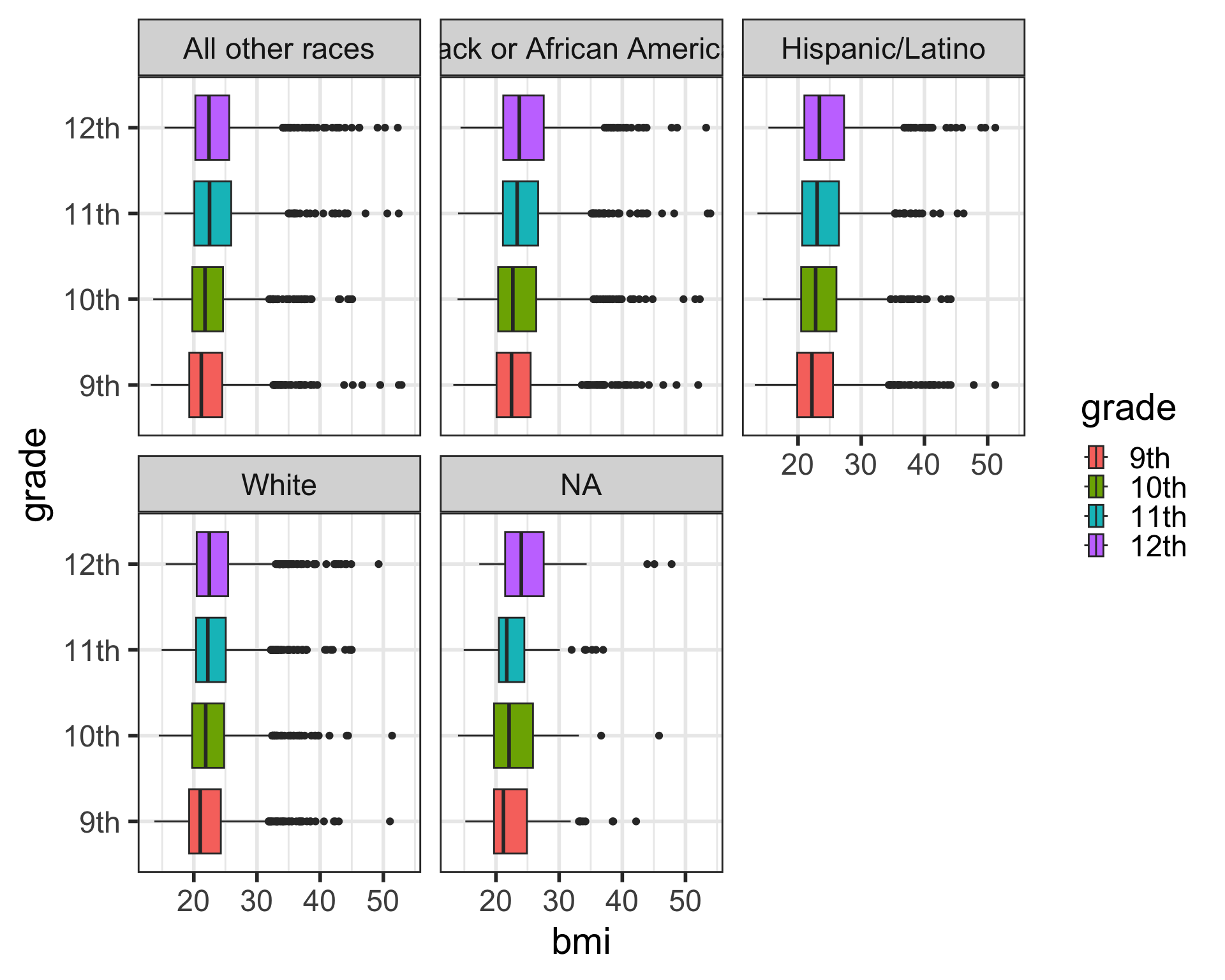 facet_grid()Facet the boxplot below by age and grade, don’t forget the vars():