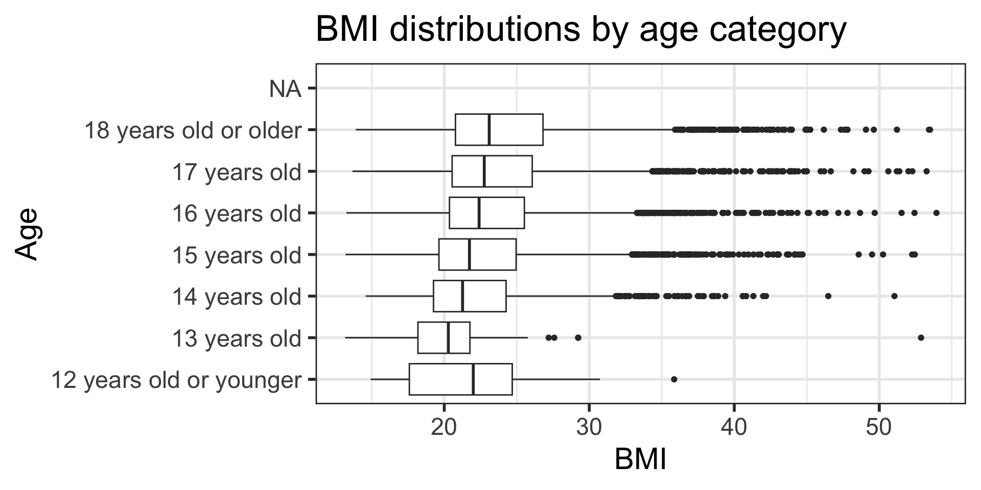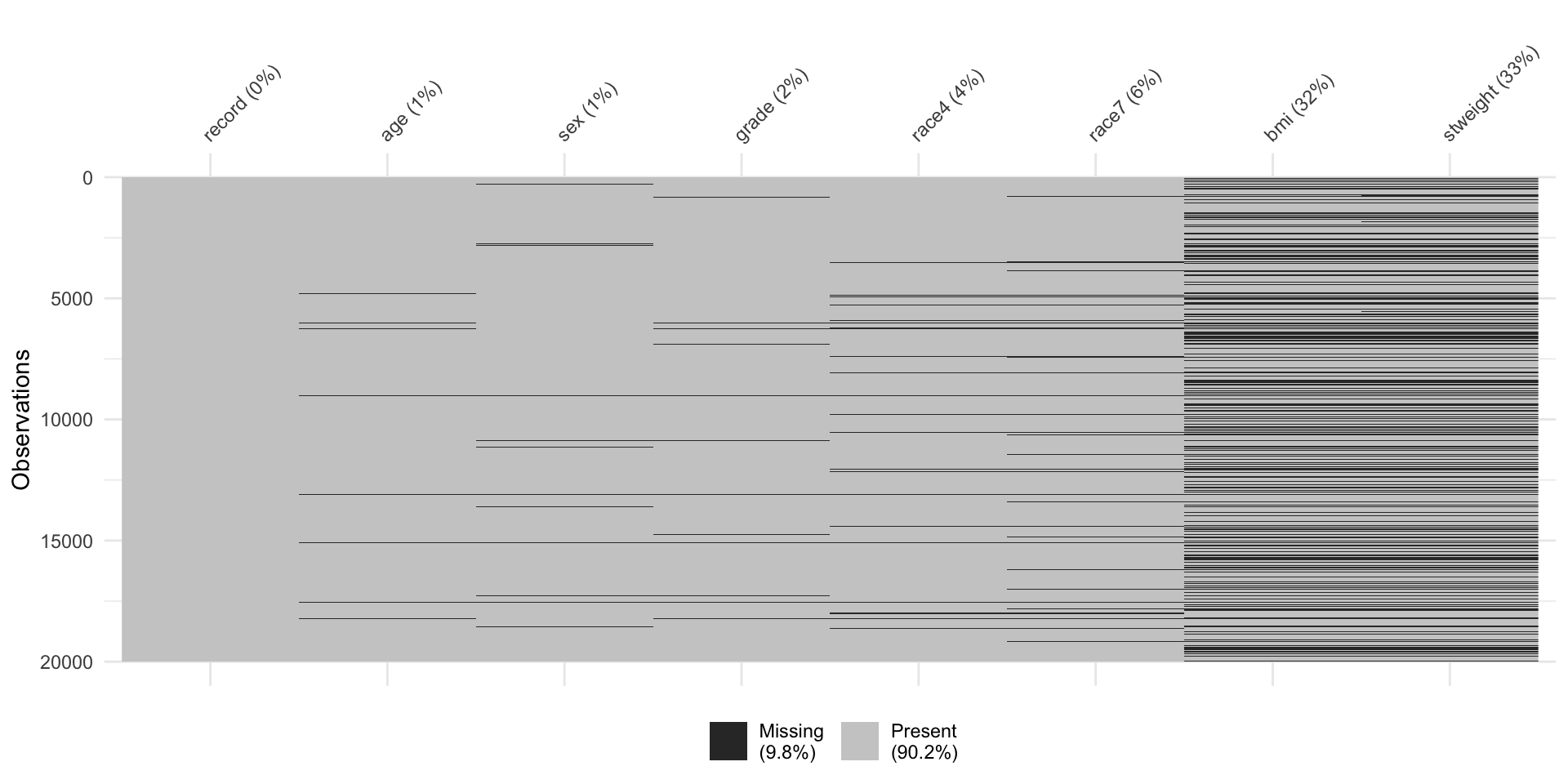 $ bmi <dbl> 17.1790, 20.2487, NA, 27.9935, 24.4922, NA, 20.5435, 19.2555,…